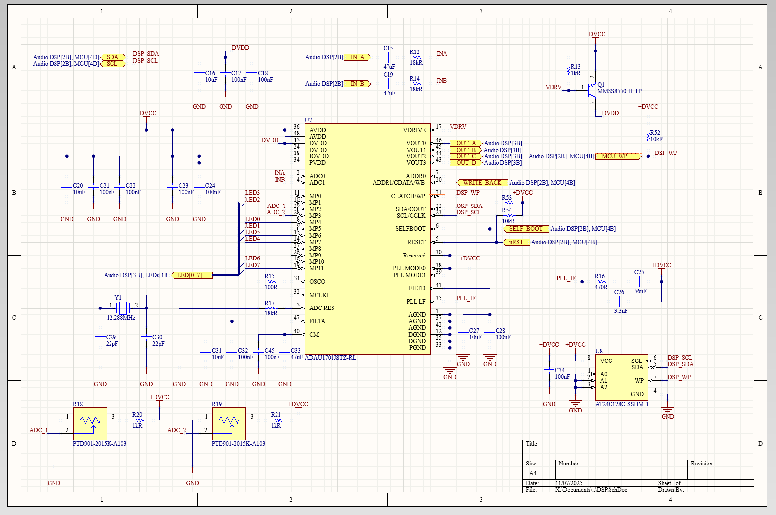 Creation of an audio signal processor centred around an Analog Devices DSP chipset, utilising a WiFi MCU for wireless audio processor updates.